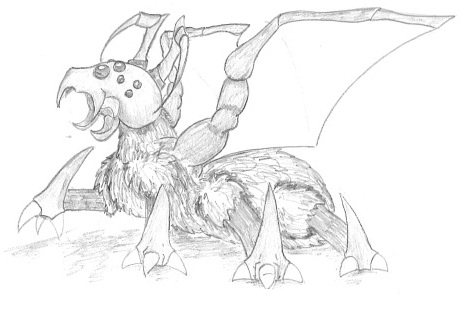 | Giant spider-like creature. From the ground to its back it's about five and a half feet tall, and snout to rear fifteen feet long. Its second legs have been modified into wing-like blades. They're usually kept against the side of the body, but they can be twisted to the front and used to deliver a dual karate chop.