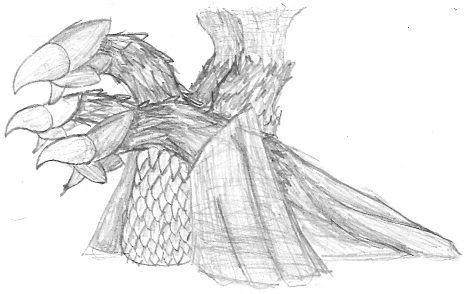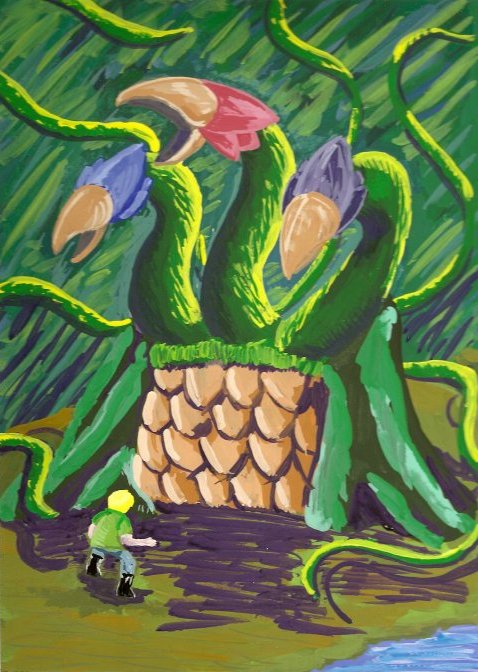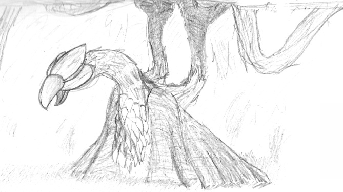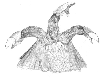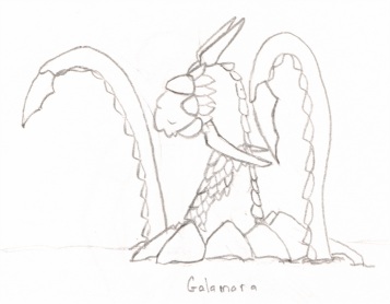 ![]() A one-headed Galamara. A more level side-view. Crude colored pencil sketch of Galamara's head to demonstrate the color scheme. An alternate Galamara design that has three heads. The petals on their heads from left to right would be blue, pink, and purple. Three-headed version from the side, includes the trunks that go into the ceiling. The very first Galamara drawing I did. You've come a long way, baby. |