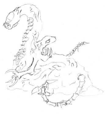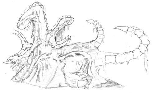| A zombie dragon-like monster whose origins are probably related to a Resident Evil-like virus. After years of lying in a heap slowly rotting, its body has warped, areas have merged together such as its chest cavity to its neck, and its head tilted on its side. Its left hand was deformed and broken, exposing veins which secrete a green, toxic, pus-like ooze. It looks to have a second head in its back protruding from where the neck meets the shoulders, although it is actually a second, smaller, maybe even a baby specimen whose body fused to the back of the larger one.