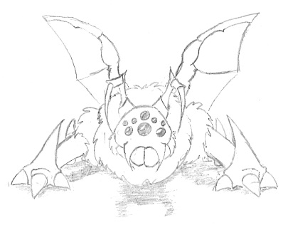 | Giant spider-like creature. From the ground to its back it's about five and a half feet tall, and snout to rear fifteen feet long. Its second legs have been modified into wing-like blades. They're usually kept against the side of the body, but they can be twisted to the front and used to deliver a dual karate chop.