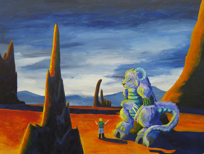 ![]() Landscape painting. After I did the first set of paintings, somebody in my class suggested making life-sized paintings of the three beasts. I think you can see why I wasn't too keen on that idea. (Acrylic on canvas, actual size 40" X 30") ![]() Old sketch. ![]() Rough notebook sketch compared to an xkcd character. In this version, I decided to make its arms scaly instead of furry. ![]() Cute baby chimera! |