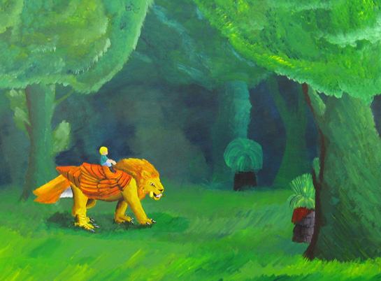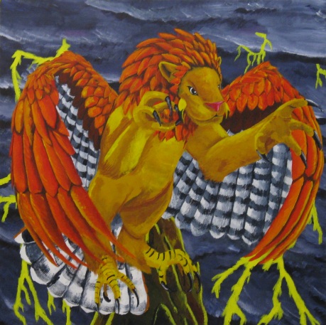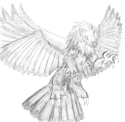 ![]() Little dude riding a griffin through a forest. Acrylic on canvas, actual size 40" X 30". ![]() Old sketch. I drew the image too low on the paper, and couldn't draw the left wing and right tail. ![]() A xerox of the main image, colored with pencils. This color scheme didn't stick very long. |