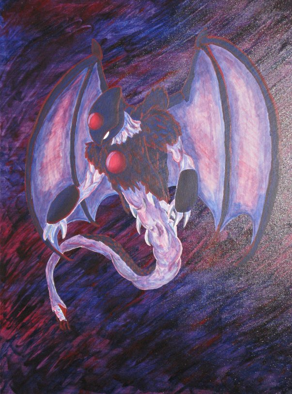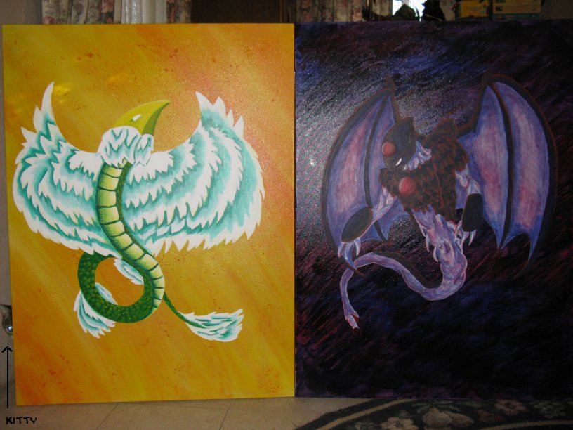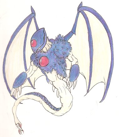 ![]() Diptyich of Maaza and Meragidd. With Arlene peeking in from behind Maaza. If you're noticing Meragidd is identical to the ink and colored pencil drawing above, it's because I used a projector to copy that image to the canvas. Maaza, however, is completely different from her colored pencil image because somebody stole said projecter in between the two paintings ): ( Slightly older version (the spikes on his body aren't as well defined). I just could not photograph this painting without the glare because the ink I mixed into the medium to make the warped effect in the background makes it super shiny, and a pain to photograph without getting a glare or making the image blurry. (Acrylic and india ink on canvas, actual size 30" X 40") Crude and somewhat old colored pencil sketch made to demonstrate his color scheme though I'd probably color the main tail the same color as his flesh and the flesh parts are too yellow. The actual design is somewhat innacurate - note how the lower wings attach to his back instead of his hips, and the side of the head doesn't have the oval-shaped "peels".