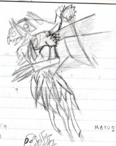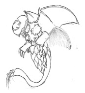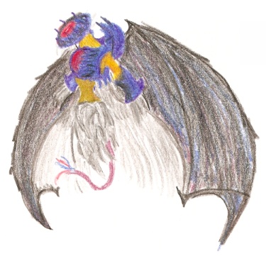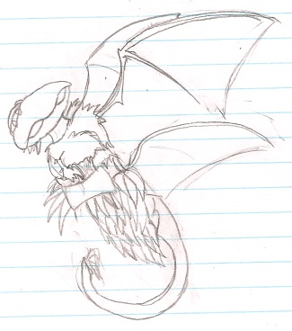 A somewhat chibi (what with the slightly large head and small body) notebook doodle, but it's actually remarkably accurate how I imagine him down to the angle he hovers in. Too bad there's so many stray lines and you can see all the pink smudges where I erased because the notebook I drew this in has really crappy paper (in fact, you can only use one side of each sheet, because if you try to erase on the backside the eraser will actually strip away layers of the paper). Notebook doodle, more of the front seen than normal and his tail has a more accurate length and whippiness. |