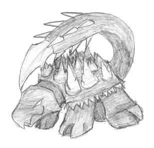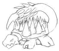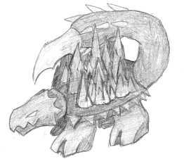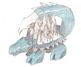 ![]() The ice stalagmites on this one are too small, and the head doesn't have the spikes, but mostly it's the same deal. ![]() A notebook doodle that squats closer to the ground These images are both missing the small, middle stalagmites. ![]() Xerox of the main image colored with pencils. |