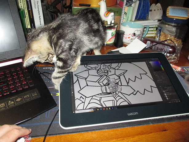 I adopted a kitten who embodies the phrase "if it nots for sits, why it made of warm?" and kept climbing on my Wacom One and batting my stylus while I was trying to work on this.