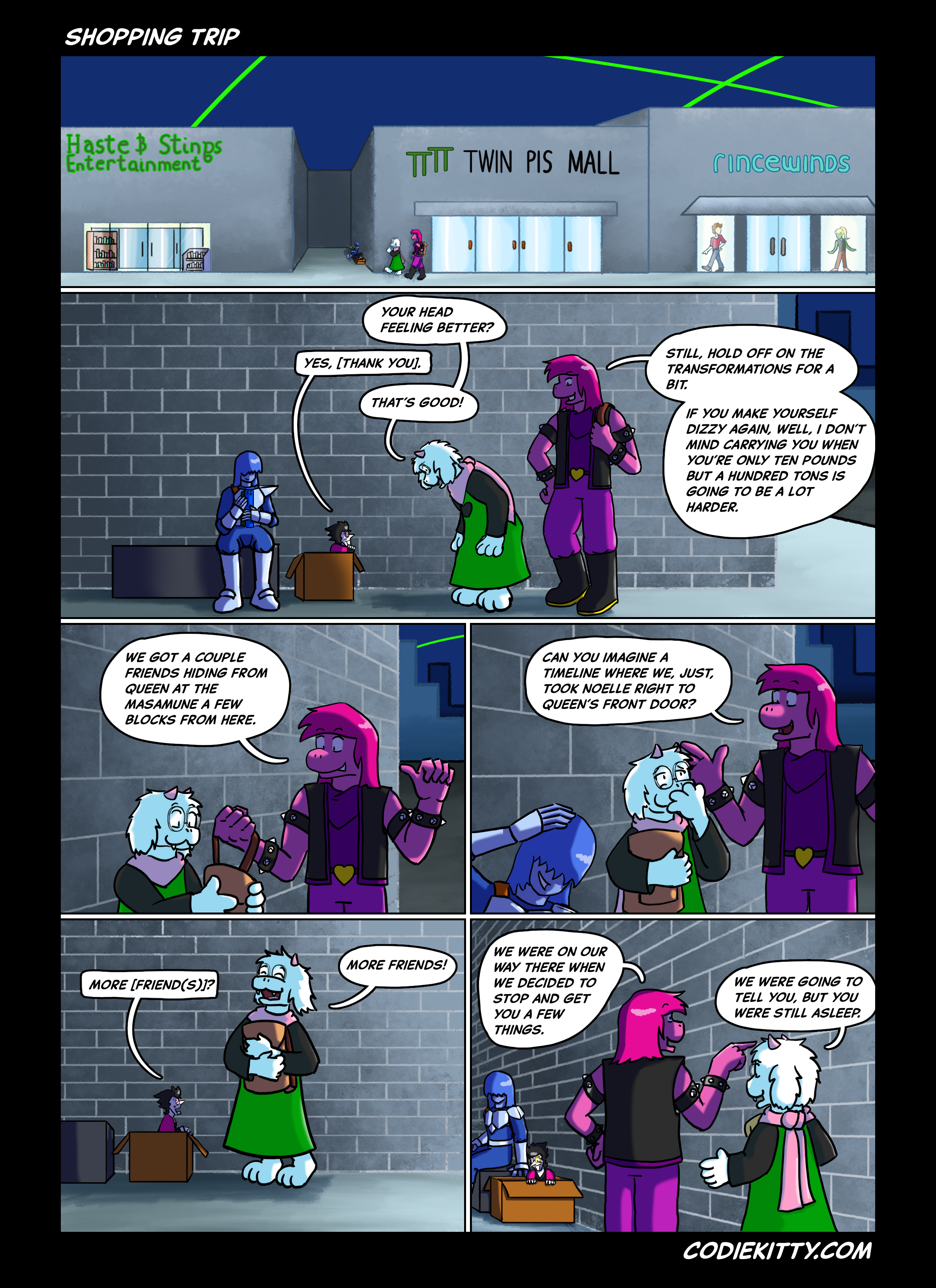 A lot to unpack in those first few panels. The name of the mall is obviously a Back to the Future reference, but while making the comic I noticed two Pi symbols could be read as "Pi Pi" or Pipi, the eggs Spamton uses in battle. That's just an amusing coincidence.