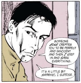 This revelation enrages Buddy, who loses his shit and throws Morrison out of a window, killing them. Then Morrison reappears behind Buddy (because this isn't really Morrison, it's just a drawing of them. Ceci n'est pas Grant Morrison, you might say), the window is repaired, and Buddy sheepishly wonders why he did that. He did it because Morrison made him do it, and they can make Buddy do whatever they want. Where else have I seen somebody acting uncharacteristically violent while being controlled by somebody else?