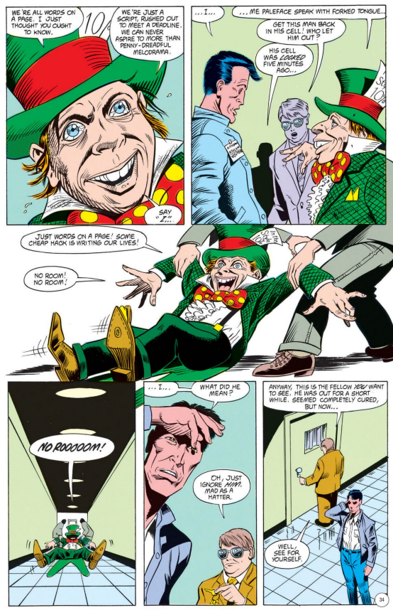 One character to notice something strange going on is a Native American Physicist named Jim Highwater. He comes home to find a copy of Alice in Wonderland, just, lying on the floor of his living room with a note tucked into it. He follows the note to Arkham Asylum - yes, the one from Batman, this is DC after all - where one of the inmates is a cartoonishly dressed little man raving about how everything is just a game words on a page.