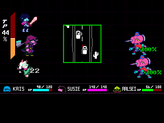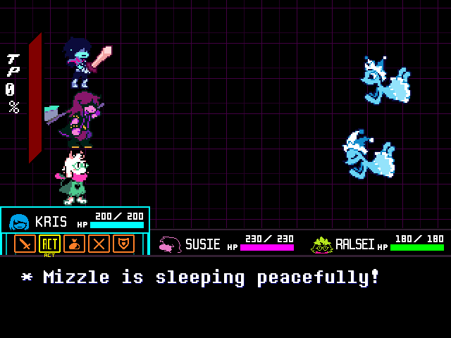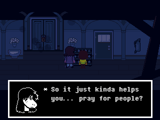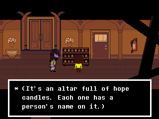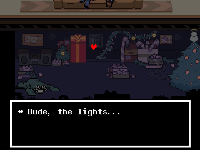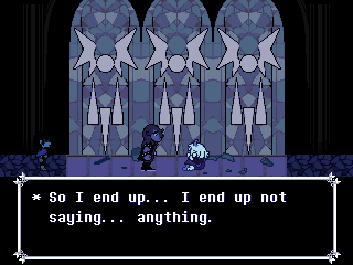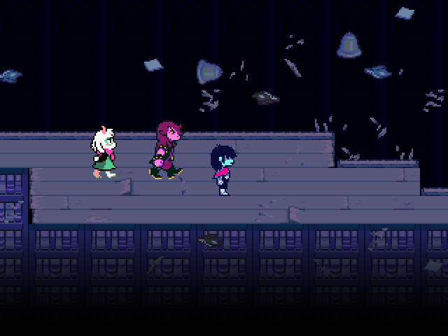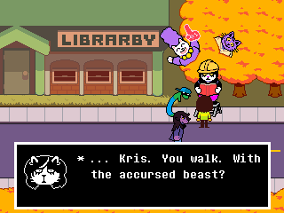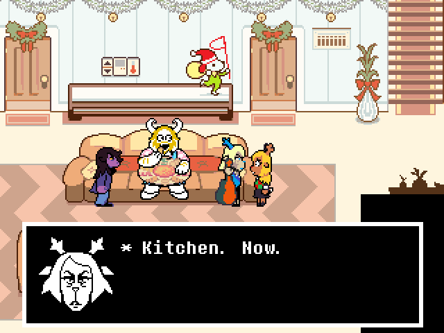 Chapter 4 starts with its Light World town segment as Susie joins Kris and Toriel for church. After that you're free to screw around town, trash a diner, check on your new Castle Town recruits, and find Tenna a home if you're ready to say goodbye to him. Finally you head to Noelle's house to look for clues on the bunker, leading to a prolonged Tom and Jerry sketch between Kris and the player.