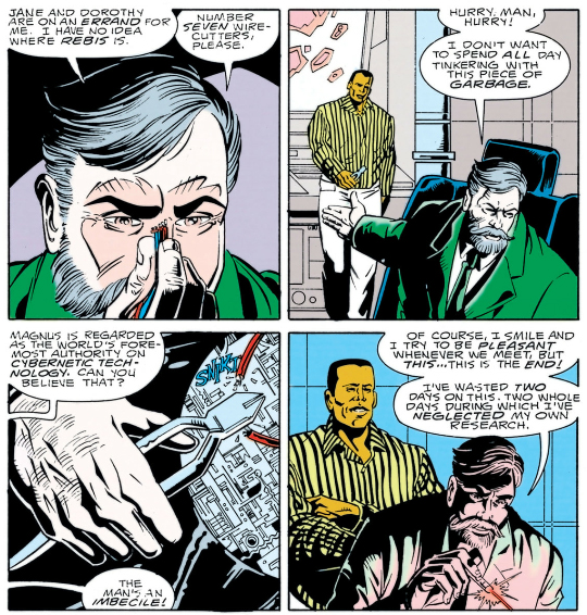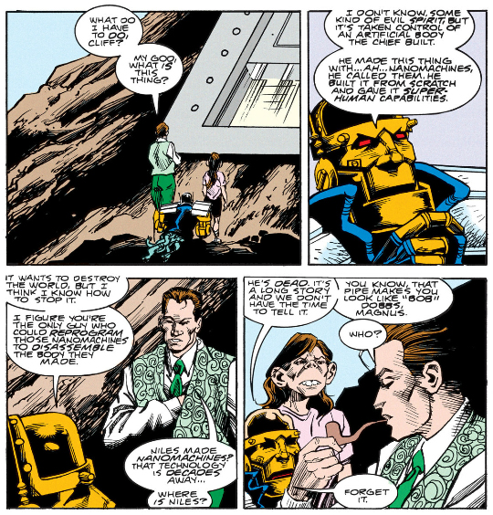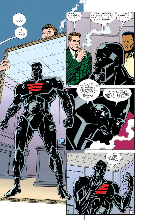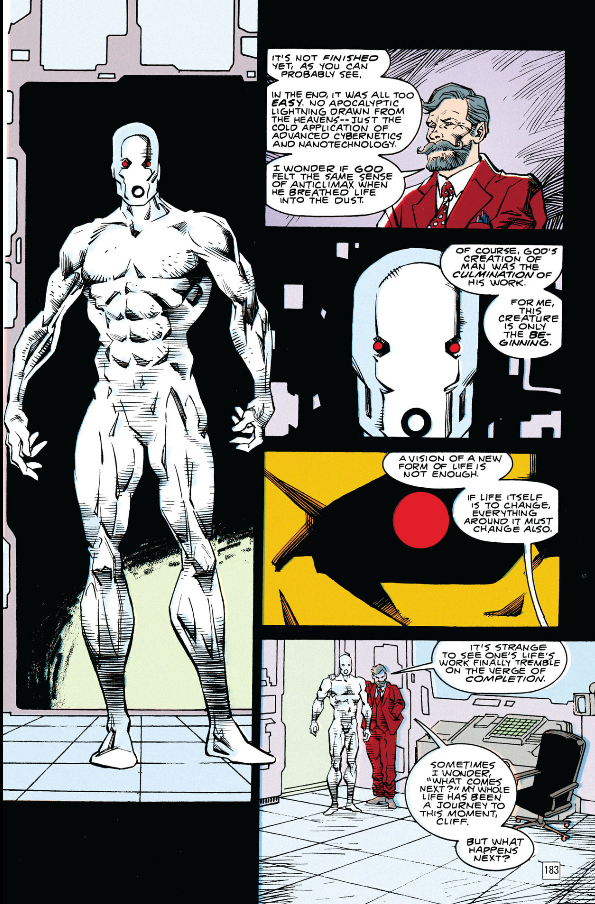 This is a body William Magnus made for him after witnessing his meltdown here. Unlike the bodies Niles Caulder builds this one is capable of all five major senses in particular touch, much to Cliff's delight, but he only has it for the Nurnheim arc because it soon begins to malfunction. When the events in Nurnheim are wrapped up Caulder removes Cliff's brain to figure out what's wrong with the body, dismisses it as a piece of junk fitting of Magnus, and storms off.