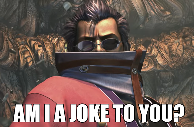 Sure, you do attack him and get a weapon from him, but the whole thing is a friendly sparring match instead of a fight to the death. Him, I was actually able to beat, on my first try even. Barely, yeah, but considering I was focused on screenshots and laughing my ass off I think I did all right. On the plus side none of his attacks have screwed up hitboxes that just made me angrier and angrier with each attempt, nor did his battle music make me want to pull my hair out.