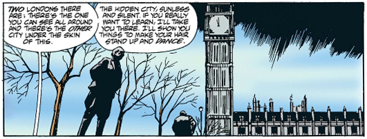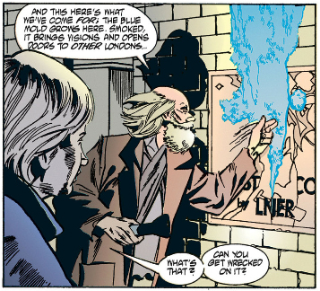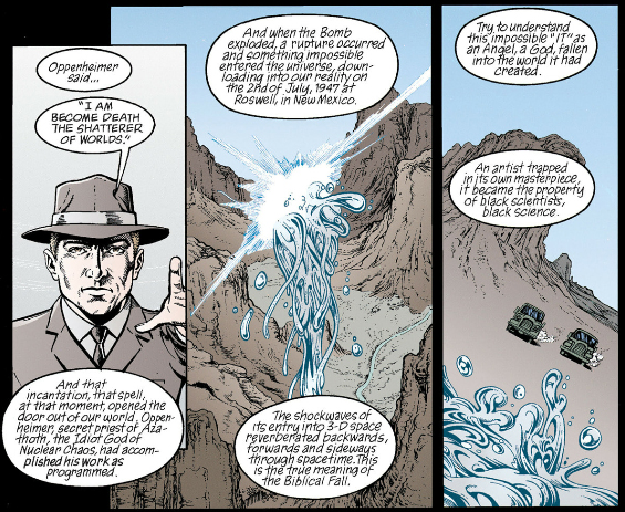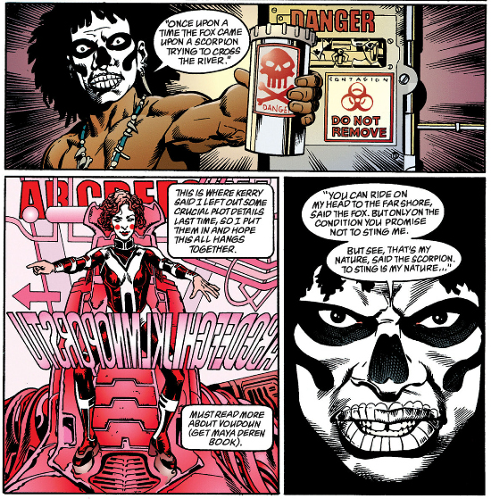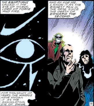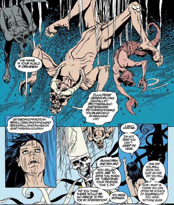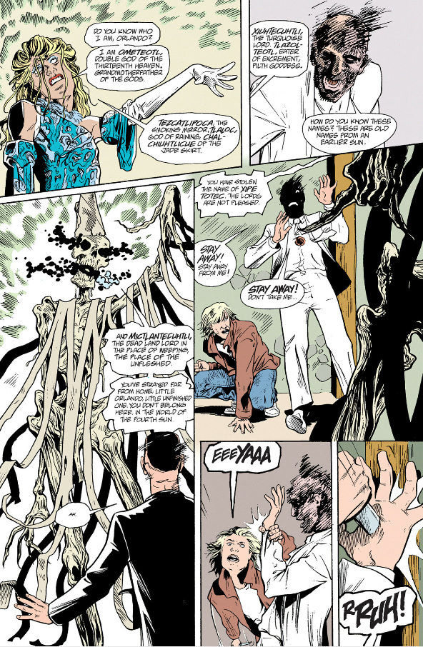 Now, recall J.M.E. McTaggart's B Theory on time from that Grant Morrison video, and how it asserts all events occur alongside each other. Early in The Invisibles the team gets attacked by a demon called Orlando, and Lord Fanny calls upon the Aztec god of the dead, Mictlantecuhtli, to deal with him. Several issues later we flash back to Fanny as a teenager and her initiation into magic during which she encounters Mictlantecuhtli, demanding compensation for his intervention with Orlando.