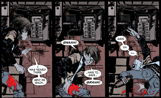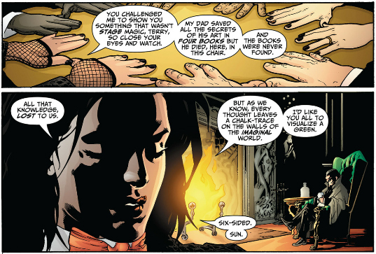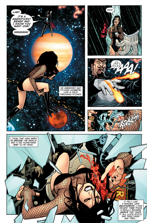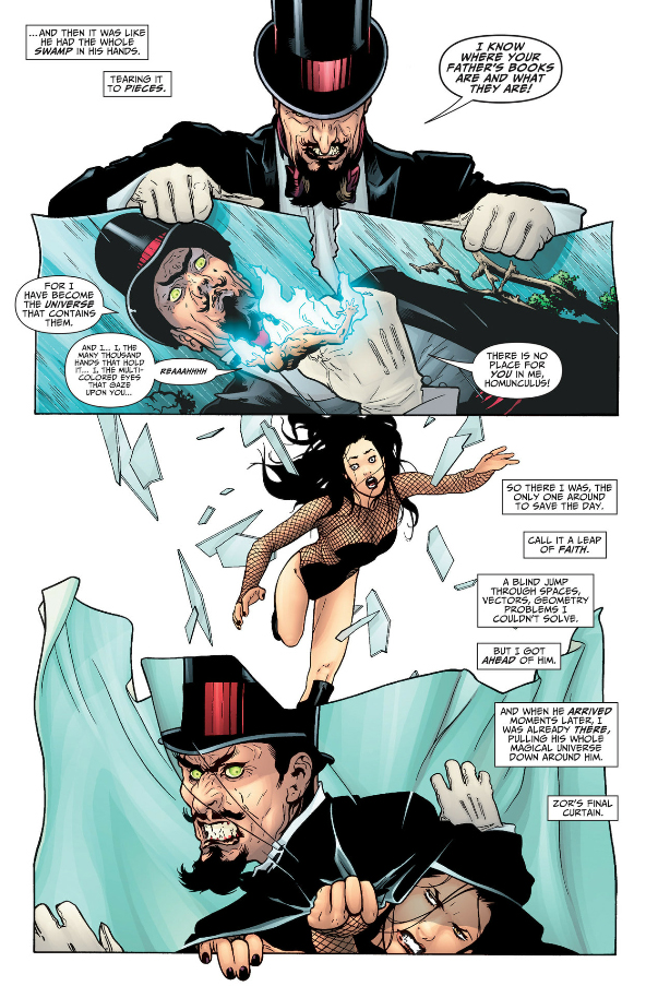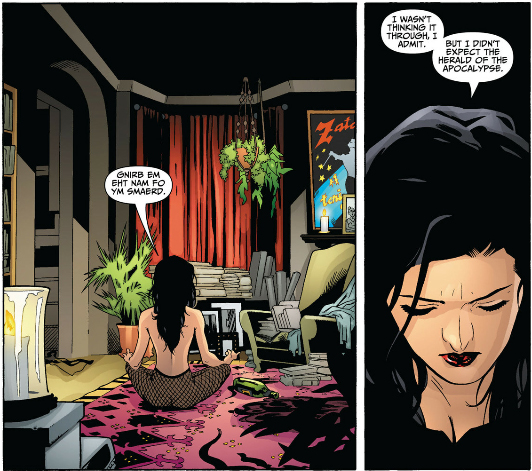 Susie punching the prophecy and cutting her hand reminds me of Buddy headbutting the bathroom mirror and cutting his forehead. Zatanna also cuts her hand on the jar containing the sprite of living language during her fight with Zor.