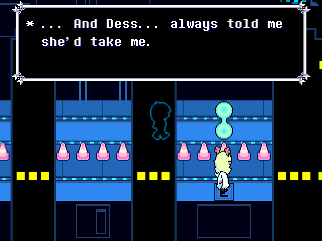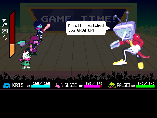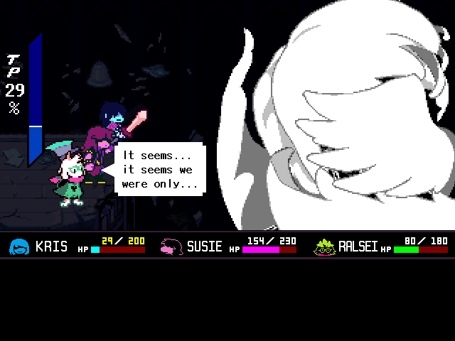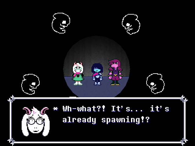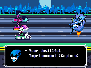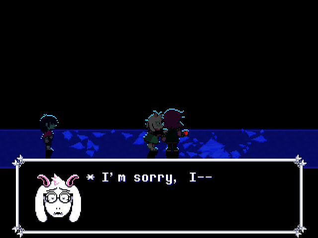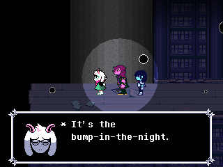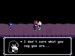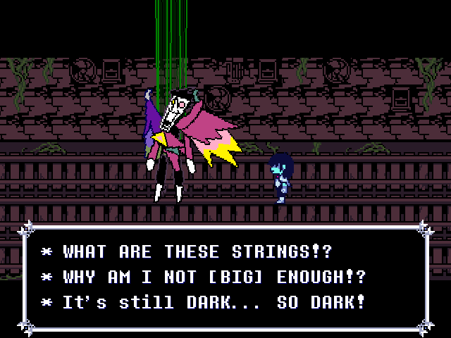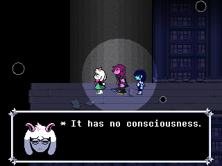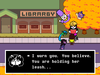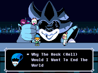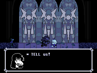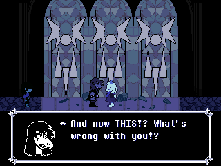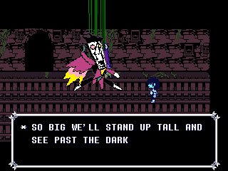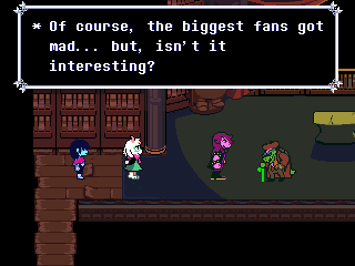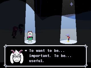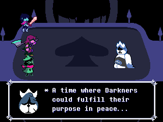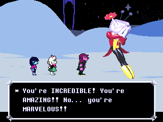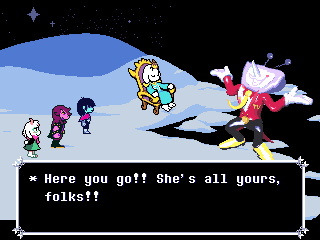 Susie insists that's a crock of shit and agrees to find him a new home in exchange for Toriel because while his time with the Dreemurs might be over, surely there's somebody else out there he can serve. Tenna happily obliges but his joy is cut short when he's attacked - and from what I understand you have to both beat him mercifully and recruit all the Chapter 3 Darkners or else he's killed - by...