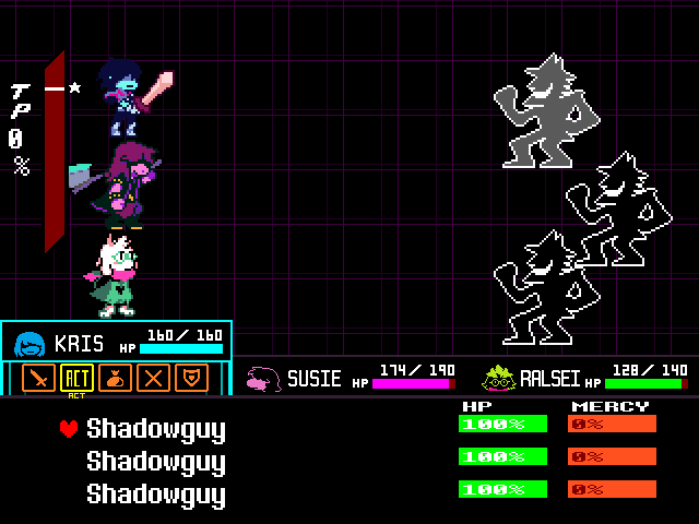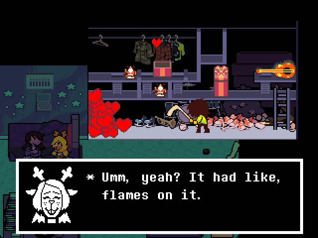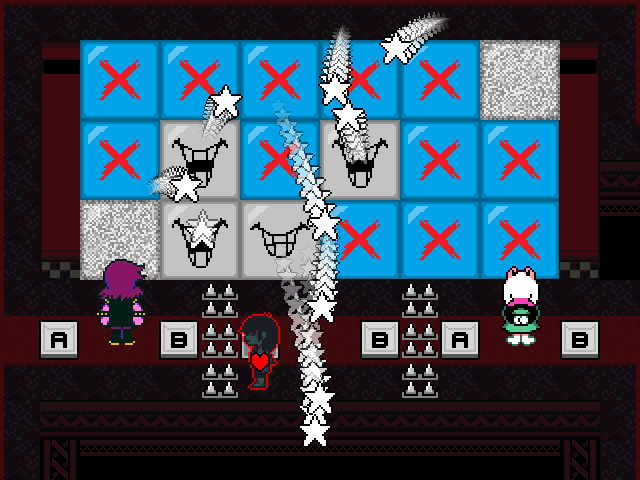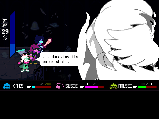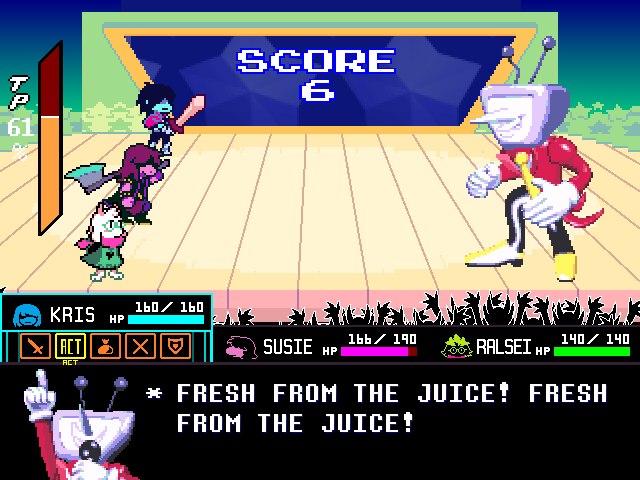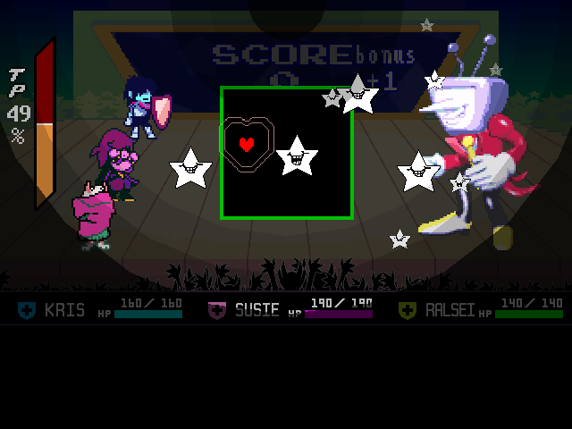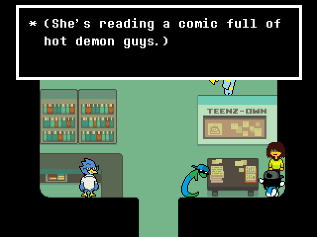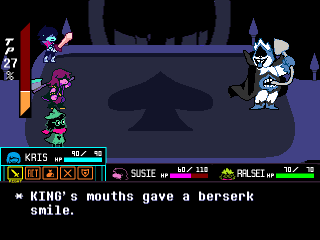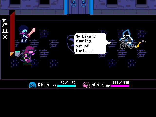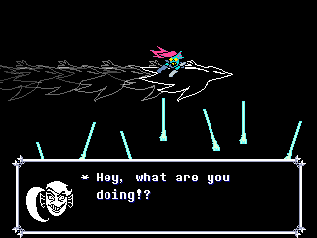 Susie insists that's a crock of shit and agrees to find him a new home in exchange for Toriel because while his time with the Dreemurs might be over, surely there's somebody else out there he can serve. Tenna happily obliges but his joy is cut short when he's attacked - and from what I understand you have to both beat him mercifully and recruit all the Chapter 3 Darkners or else he's killed - by...