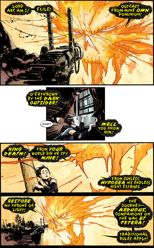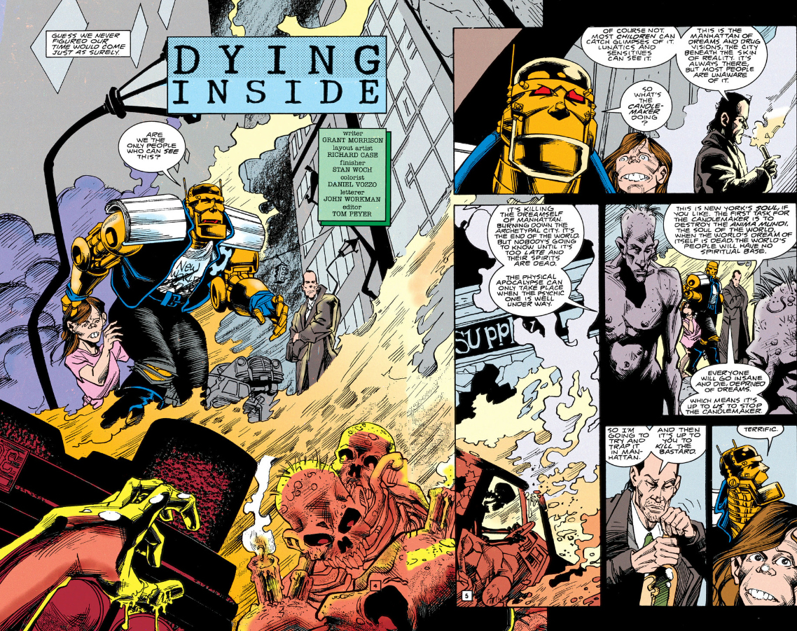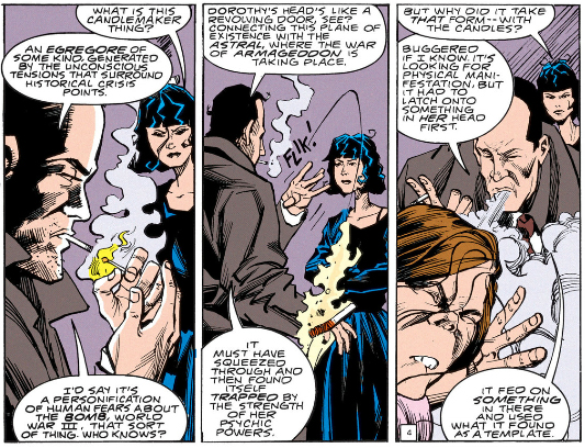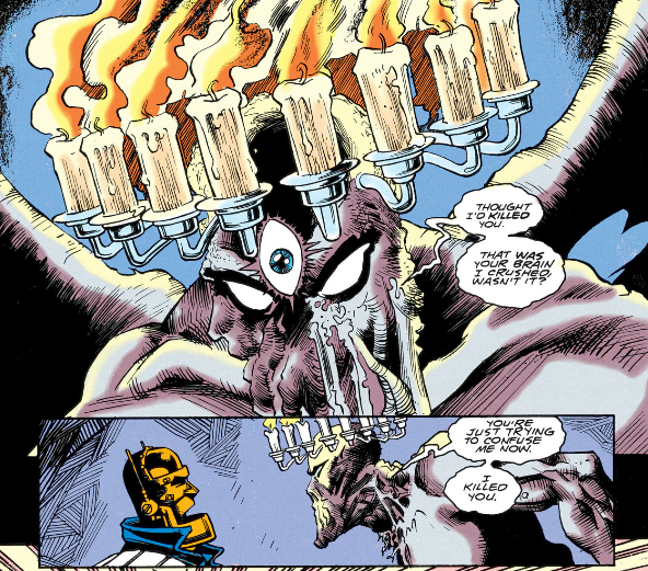 More weird shit with the Titan and the Candlemaker: when the Titan first appears it looks human then turns into the angelic form for the boss fight, the same way the Candlemaker possesses the blank body then morphs it into its angelic form. Both's faces look like they're melting. The Titan has a bunch of weird protrusions coming out of its head, some of which look like flames and one even looks like an arm of the Candlemaker's candelabra rotated around. The Candlemaker has long, pointed fingernails in both Dorothy's visions of it and on the cover of the sixth volume of the six-volume Doom Patrol collection. Both will leave the dreamless higher reality "shambling aimlessly towards oblivion" and "lost eternally in an endless night."