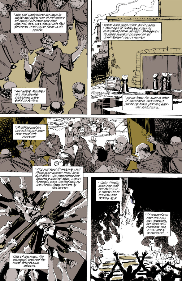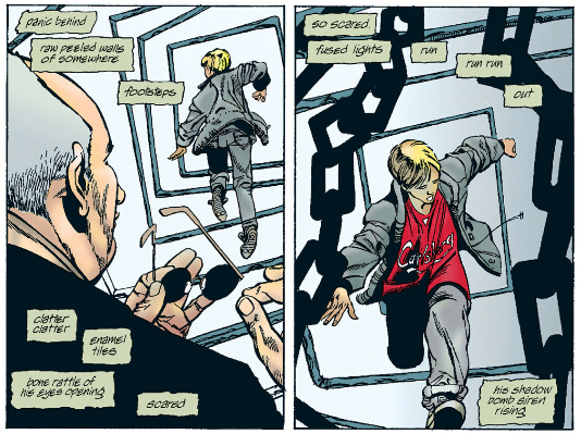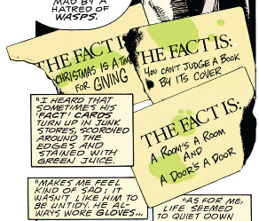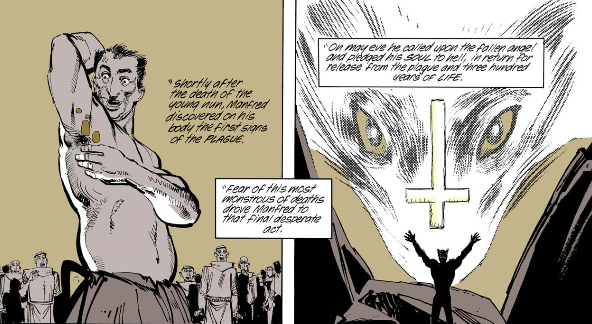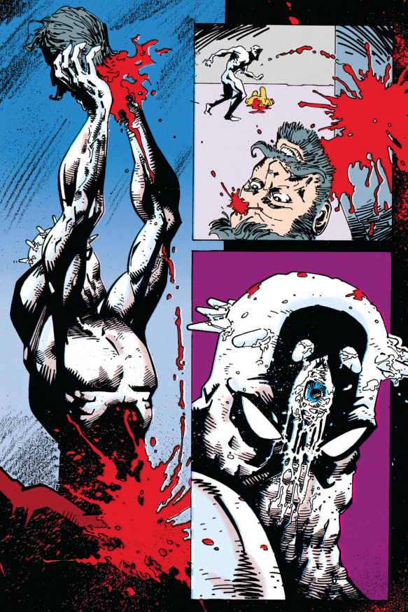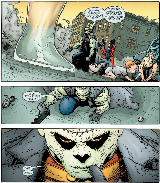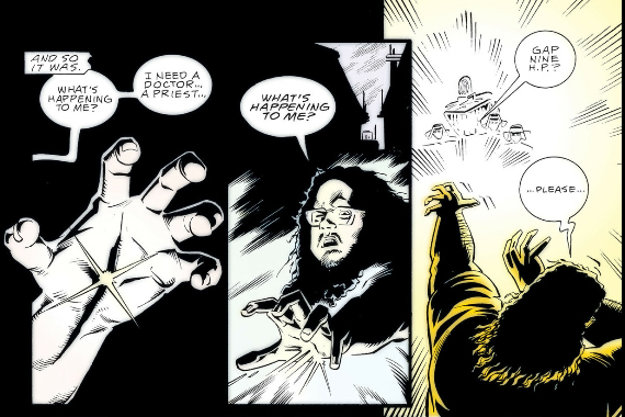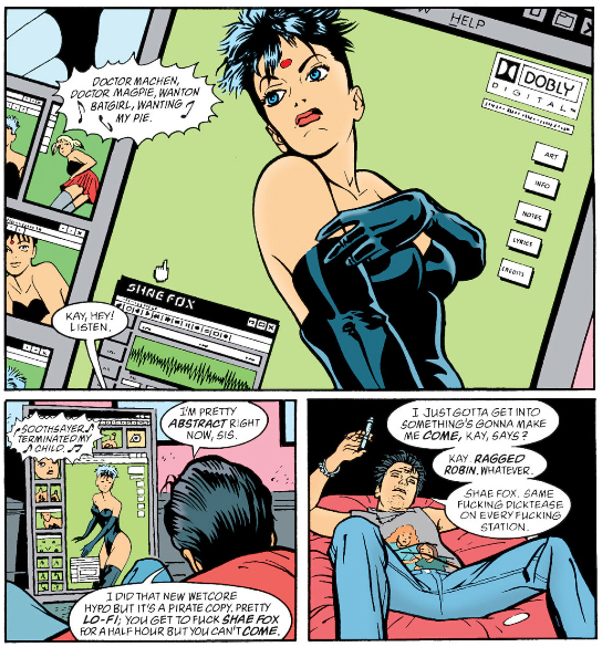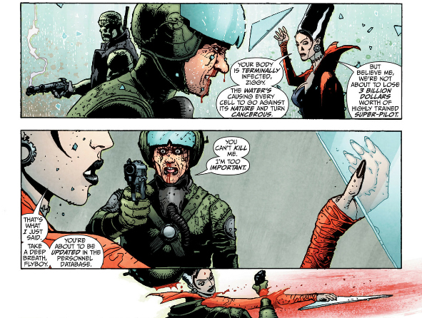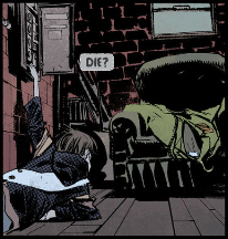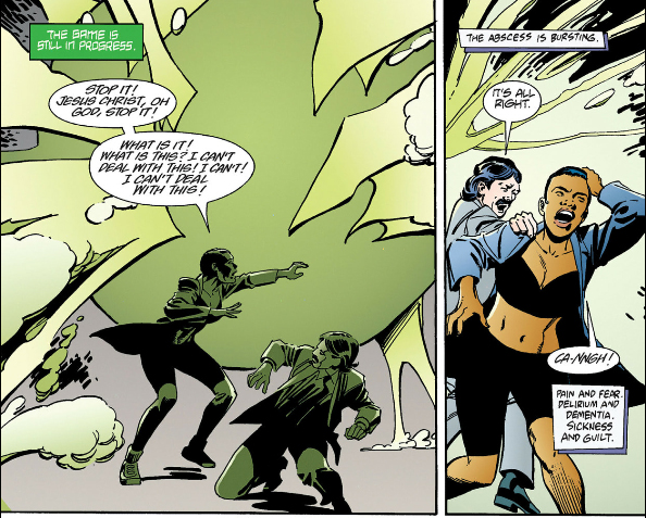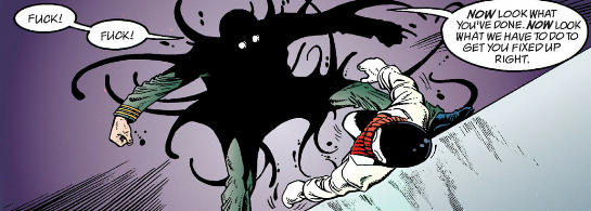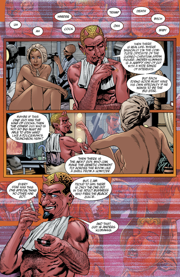 As for The Filth, it's at least much shorter than The Invisibles but almost as impenetrable and fucking nauseating on top of it. Ostensibly it's about a man, Gregory Feely, who just wants to take care of his sick cat but he keeps getting dragged into missions to save the world by some secret organization who - I think? - replace him with a doppelganger when he's on a mission, and the doppelganger eventually kills the cat by neglect. But according to Morrison a major influence on the book was porn so there's phallic imagery everywhere and one of Gregory's missions involves this porn star whose, let's say, "man juices" are black and a porn director who somehow turns his "tadpoles" into giant monsters that fly around the world, skewering women through their lower abdomens. I am not including images of this shit.