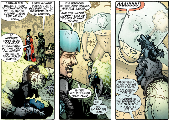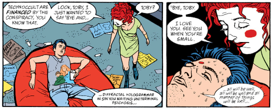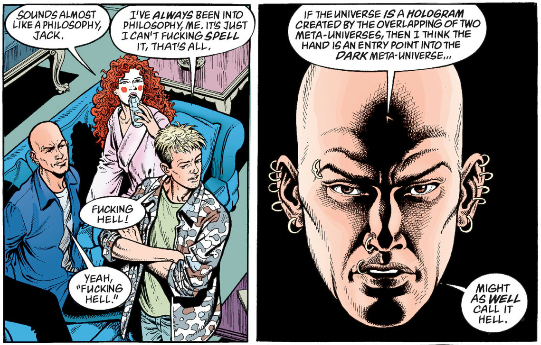 I'm sure there are people who feel different, but I like narratives where the philosophy serves the story. The Invisibles is the other way around, with the story being a vehicle to deliver the philosophy, and it's just so tedious to read an old man babble about magic for two whole issues, or walls of text about parallel worlds that honestly Doom Patrol did better, or King Mob and Ragged Robin bang every other issue. At some point one of the main characters is revealed to be one of the insect aliens who adopted the personality of a human woman so she could infiltrate the Invisibles as a sleeper agent, and then surprise! This was all a ruse by some other Invisibles to root out a... bug or something in her memory, and she's totally who she thought she was! Well, that was a great use of my time!