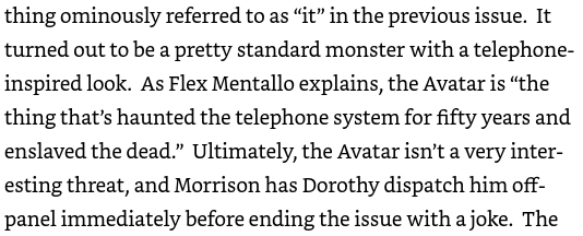 Another book I read was Grant Morrison: The Early Years by Timothy Callahan which had a number of useful analyses on the themes and symbols of five of Morrison's early books and their love of anticlimaxes but overall wasn't quite as informative as The British Invasion (heck, that book is where I learned about Joe the Barbarian). Callahan also has a habit of explaining events out of order, like he details how Flex Mentallo turns the Pentagon into a circle in the battle with the Telephone Avatar before he even mentions the Avatar, then has to go back and explain what the Avatar is. He also seems to misunderstand how the Telephone Avatar is defeated, thinking Dorothy kills it after encouragement from the Candlemaker when the Candlemaker is the one who kills the Avatar after Dorothy asks it to.