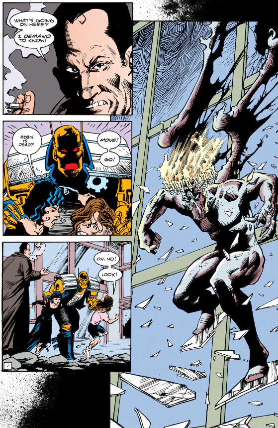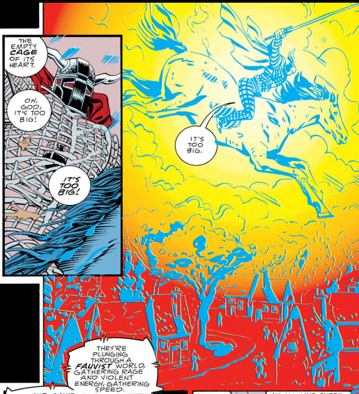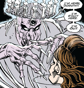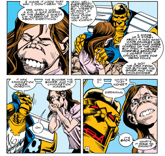 I mentioned Agent "!" having a cage for a torso, but when the Fifth Horseman of the Apocalypse first appears he's just a wireframe with a bird cage inside. So, like, a cage within a cage. The Doom Patrol's first attempt to stop him has Jane placing herself in the smaller cage in an attempt to control him.