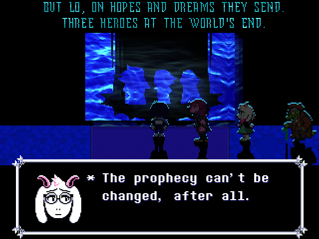 In The British Invasion Carpenter talks about Morrison's alien abduction and compares it to a story about Samuel Taylor Coleridge writing "Kubla Khan." The story goes that Coleridge had a vivid dream and started to write it down, but was interrupted by a knock at the door and when he returned to his work he couldn't remember how the dream ended. Whenever Carpenter brings this up in one his classes he always gets students asking him if the story is real, and his response is that of course it's real, all stories are. Now, whether it's factual is another matter. So when Ralsei says the prophecy can't be changed...
