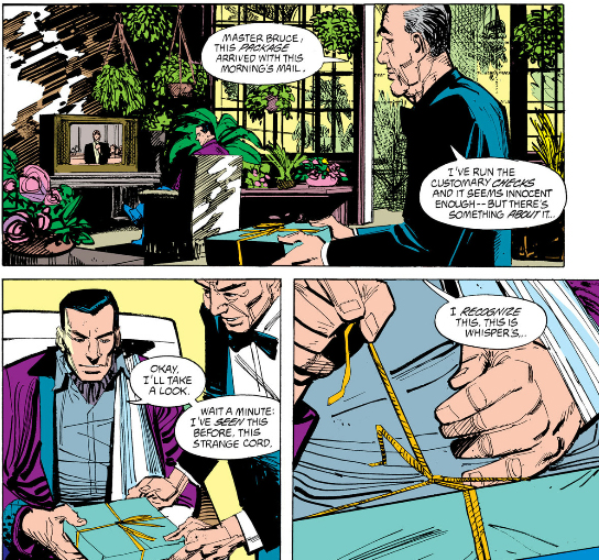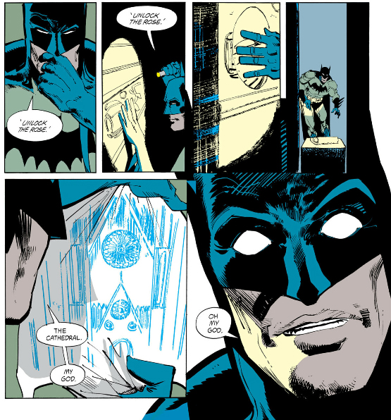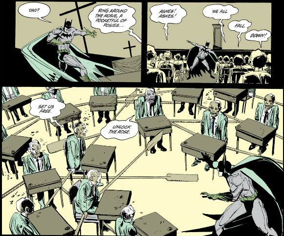 Over in Batman: Gothic, after his meeting with the crime lords of Gotham Bruce has a dream of his dead father and old schoolmates telling him to "unlock the rose." This is a reference to the nursery rhyme "Ring Around the Rosie" being about the black plague, and a hint at the connection between the plague and Gotham Cathedral.