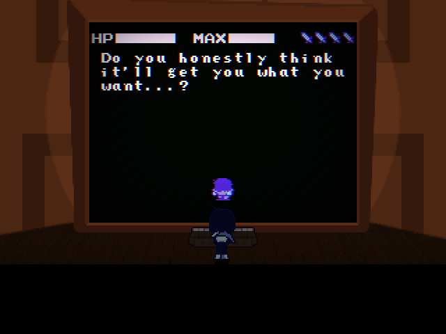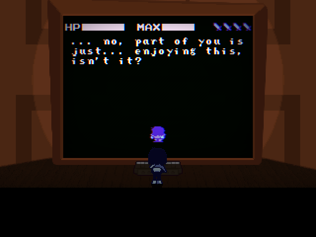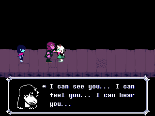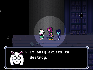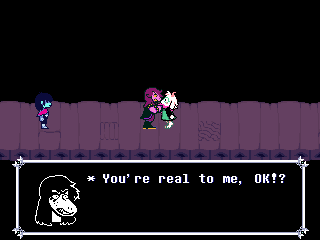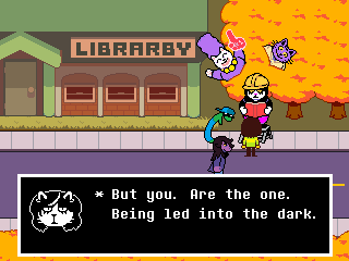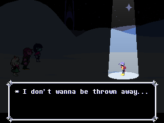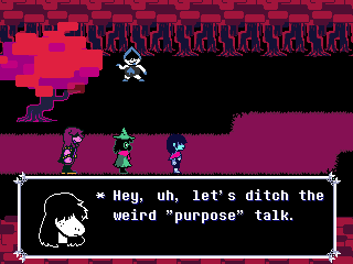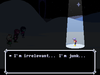 I hope this is what Fox is trying to say by shoving us into Kris and not "you ruined everything for everyone by coming into this world." And all this talk of purpose and being a part of something and nobody getting "thrown away" only reinforces what a phenomenally awful idea it would be for him to end Deltarune with the characters banding together to kick us out of the game because we're assholes for intruding on their lives and telling God knows how many depressed people "Wait, you thought any of this applied to you? Pfff-HAHAHA, get fucked!" in his ultimate subversion of expectations unless he wants to be the Reverse Alec Holowka.