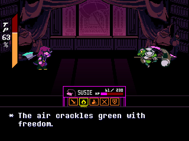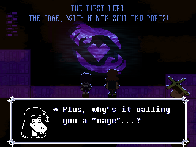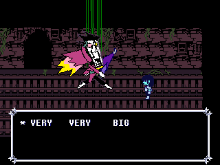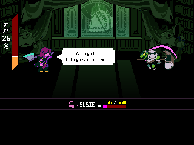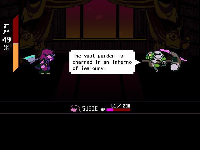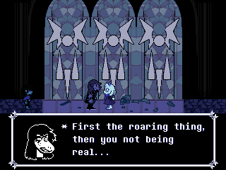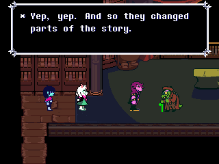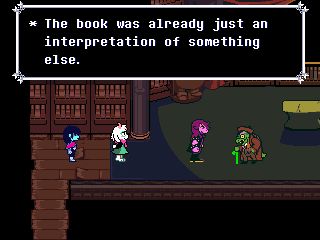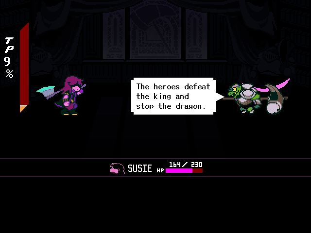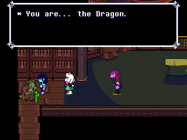 Well, Chapter 4's secret boss is a reptile man who uses the Undyne mechanics, and while the Hammer of Justice uses a hammer Undyne used a spear. You fight him one-on-one as Susie who, again, can have the title of "Dark Knight," and through the battle he makes multiple references to a book he wrote, the first chapter of which sees the heroes fighting a dragon.