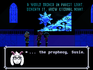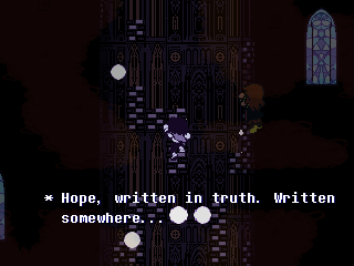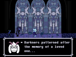 Scattered throughout Chapter 4's Dark World are these panes of glass depicting the same prophecy Ralsei tells us at the beginning of Chapter 1, though worded a little different. In fact, remember back when I was talking about Zenith, and how the chapter where Maximan tries to ascend to the plane of the Lloigor in a pillar of light formed by the alignment of the Omnihedron was called "World's End"?