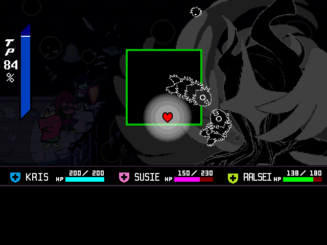 Chapter 3 differs from Chapters 1 and 2 in that it has two optional bosses, one a secret and the other a mandatory encounter you don't have to and mostly likely won't defeat, certainly not on your first playthrough. The one we'll call the secret boss is fought after a series of sidequests spanning the whole chapter and is the one we get the Shadow Mantle from. You have to complete three rounds of a grindy, genocide version of the Zelda-like you play through the main story, full of creepy shit like allusions to the Snowgrave route and having to kill simulacra of Susie, Ralsei, and Tenna to continue. And given how the second optional boss can only be won violently and is easier with the Devilsknife and Puppet Scarf, it feels like the game telling you "You want this Crystal? Then screw your goody two-shoes Pacifist run."