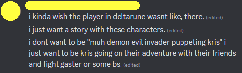 ("Codie, he meant you're an unwanted nuisance to everyone in Deltarune and should take yourself out of their world for their sake, not this world." Yeah, and I guess when Undertale says "Don't kill and don't be killed" that also only applies to the in-game characters? Tell me you don't know what an allegory is without telling me you don't know what an allegory is.)