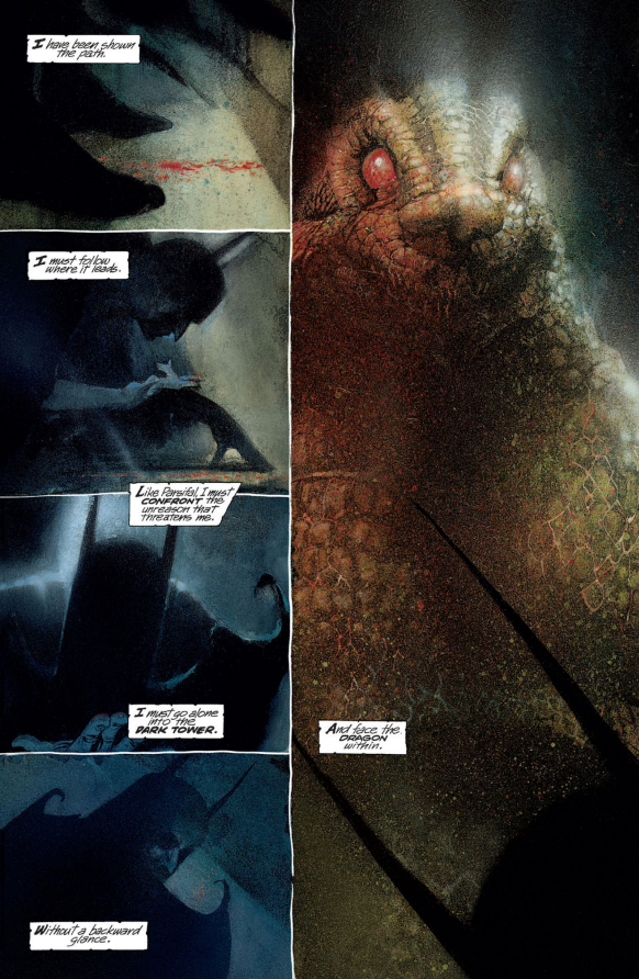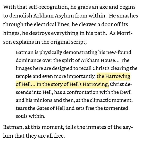I learned through Callahan's book that Batman attacking Arkham Asylum with an axe is a reference to Hell's Harrowing, in which Jesus descends into Hell and tears down the gates to free the souls imprisoned there. This is also probably where Morrison got the Harrowing in Seven Soldiers and as I already pointed out, if you drop the H and the W from "the Harrowing" you can rearrange it into "the Roaring." Would it be a stretch to call Batman the Harrowing Knight here?