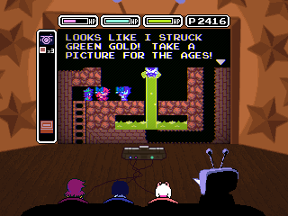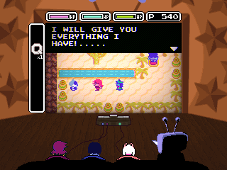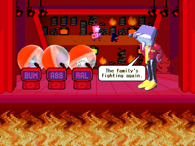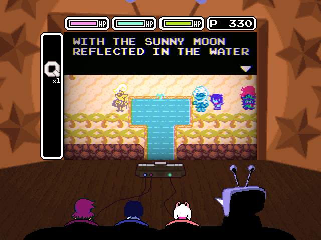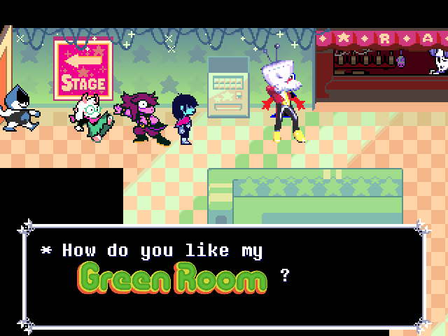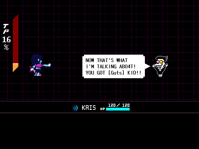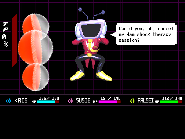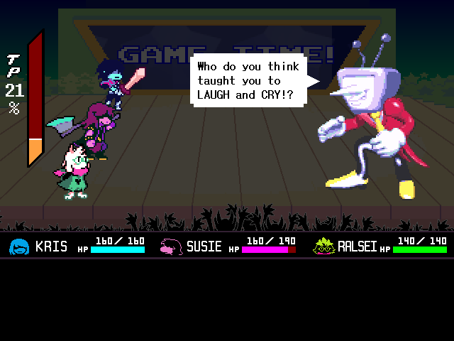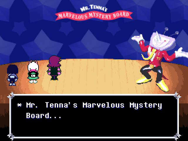 Ralsei's existential crisis is interrupted by the introduction of the chapter's main antagonist, the personification of the front room television, Mi... er, Tenna, who looks like he got lost on his way to the Hypnospace Outlaw auditions. Tenna is the most benign of the chapter antagonists so far; he doesn't want to KILL ALL HUMANS LIGHTNERS or enslave the world, he just wants to chill on the couch with the kids and entertain them with quizzes, rock concerts, and a Zelda-like video game.