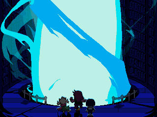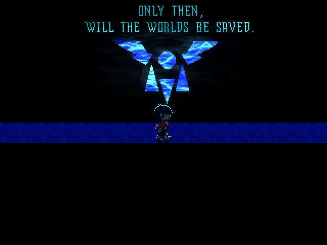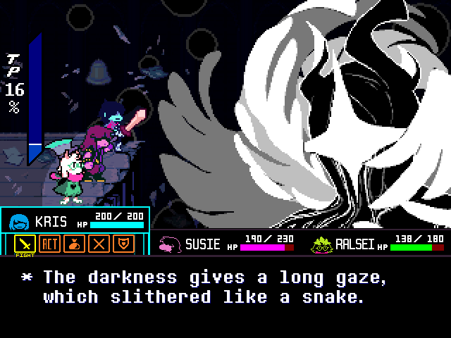 At the end of it all is a boss fight against Eram, a cackling, cape-like monster which might even be the Mantle itself, and a voice (I'm not 100% sure if the voice is Eram) that asks if Kris seriously believes the Shadow Crystals will get them what they want.
