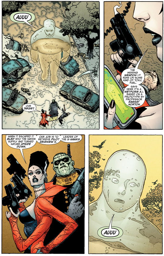 Investigating the town was just a cover story, and Frankenstein and the Bride's real mission was to extract a highly-trained pilot who went down in the town, only to find he intentionally infected himself with the water trying to communicate with it. When Frankenstein destroys the glass giant, the Bride grabs a giant shard from it and uses it to behead the pilot to preserve his knowledge.