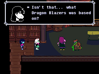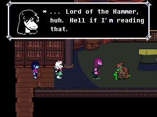 There's this in-game game series, Dragon Blazers, which comes up a lot in Chapters 2 and 3. After you beat the Hammer of Justice, Susie and Gerson discuss how it was based on a book Gerson wrote, Lord of the Hammer.