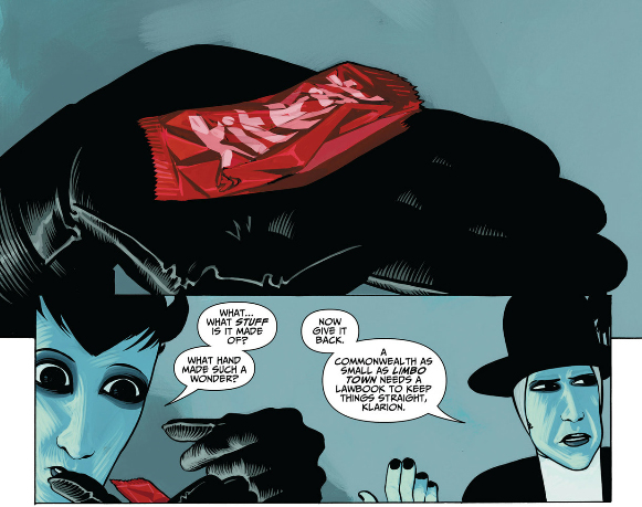 When Klarion makes it to Blue Rafters (which is the surface world, you know, the sky being blue and all), he's obsessed with all the strange sights including candy bars. So, yeah, chocolate-obsessed blue kid, you know?