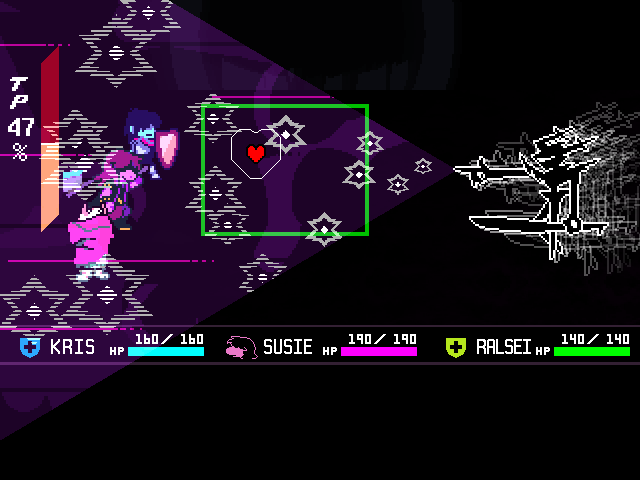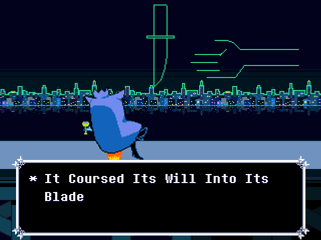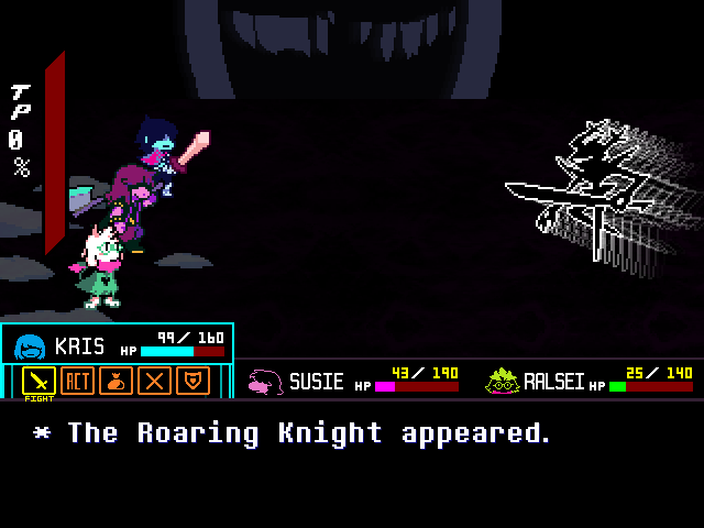 If the Knight is Dess, then her sword may be her baseball bat like how Kris' sword is their pencil. Sorry, is the Roaring Knight, the Knight of Darkness you even might say, wielding a bat? (And to clarify, no, the joke of Batman wielding a baseball bat was not lost on me.)
