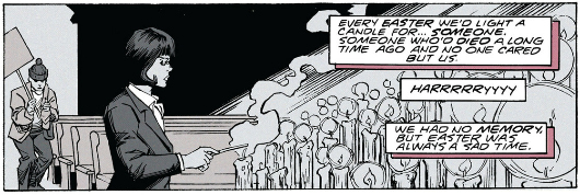 Dorothy's story about the Candlemaker, the man who would make candles for kids who were afraid of the dark, was corrupted when she learned about lighting candles to honor the dead. Jane's backstory is a minefield with what happened with her and her father and how she was split into 64 personalities and I don't want to go into it here, but towards the end of the book she goes on a trip to reconcile her 64 personalities... well, 63 as one of them, Miranda, destroyed herself before the start of the book. On this trip she thinks back to how she and the other personalities would go to the cathedral every Easter and light a candle to pay respects to somebody they couldn't quite remember.