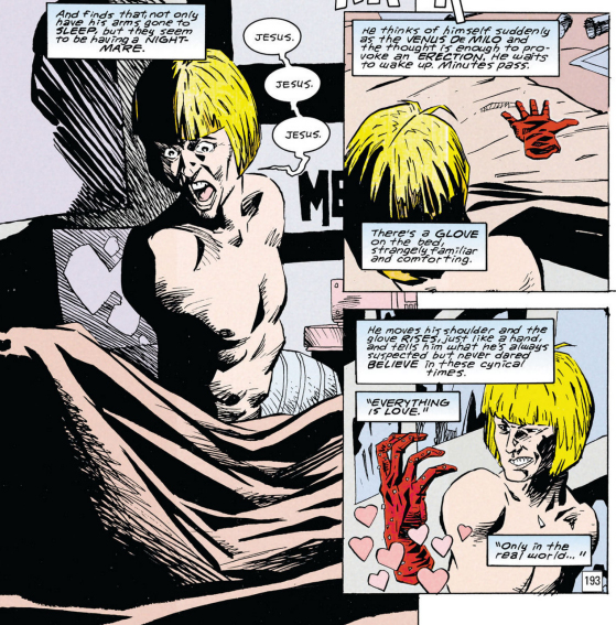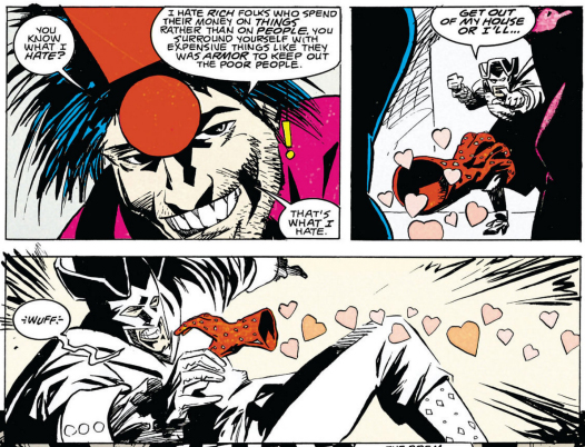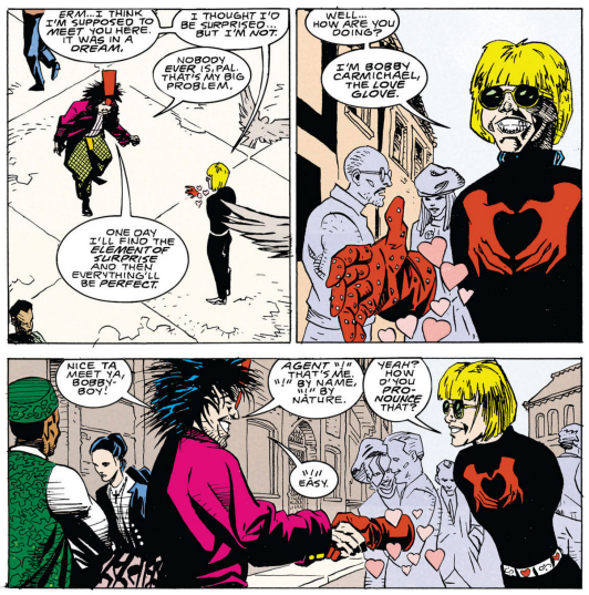 In what is quite possibly the biggest "how the fuck did I not realize this before" of this entire project, one of the members of Mr. Nobody's Neo Brotherhood of Dada is Bobby Carmichael who has no arms, but can control floating gloves Rayman-style. His right-hand glove is called the Love Glove which is also his codename, and he can reach into a pocket dimension and pluck any number of left-handed gloves from a tree (it... it's Doom Patrol, just go with it) with additional powers like the Shove Glove and the Techno-Glove (yeah, they don't all rhyme). But the Love Glove itself is constantly emanating hearts, and Bobby uses it to pacify his foes.