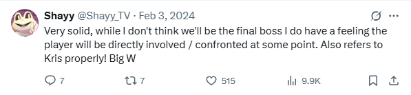 Leading up to the boss fight with him, Tenna asks if Kris remembers the good times they used to have together.