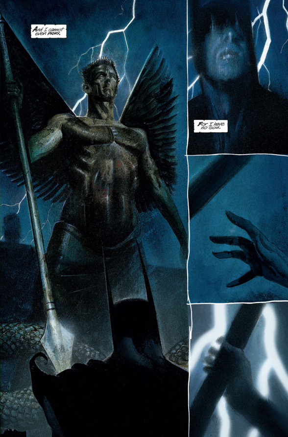 Now why was I laughing through this fight? What's so funny about it? Well, when Chapter 4 was revealed to take place in the church I thought, huh, maybe Chapter 4 will pull from Arkham Asylum, Grant Morrison's passion play where Batman was Jesus Christ. And, haha, wouldn't it be funny if Chapter 4's secret boss was based on Killer Croc? In the game he stalks you around a sewer for a bit and you drop him down a hole, but in the graphic novel Batman fights him in one of the towers of the asylum and kills him with a spear in an allusion to the warrior angel, Michael, slaying a dragon. In fact, Batman takes the spear from a statue of Michael slaying the dragon.