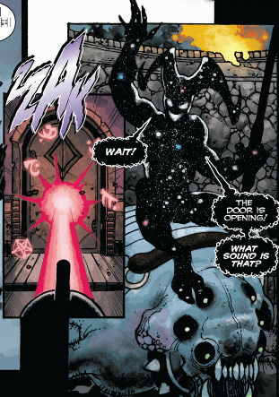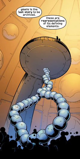When Fanny summons Mictlantecuhtli, black bubbles are pouring out of his eyes and mouth. When Bruce ends up at the end of time in Return of Bruce Wayne the aliens are consolidating the history of the universe for preservation, and there's a shot of pearls emerging from a pool of black bubbles.