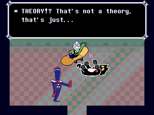 "The only winning move is not to play" is also the moral of the Earthbound Halloween Hack, and while I don't know where exactly he said this, sources tell me Fox regrets ever making that game. Even so, using a game Fox made when he was a teenager to predict Deltarune's ending would be like suggesting everything I write is going to end with a Tweeter shooting the big bad with a crappy video game.