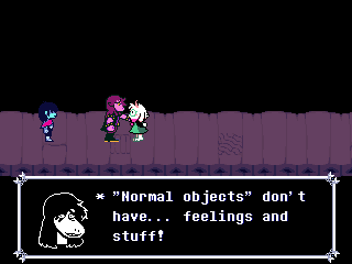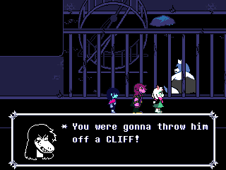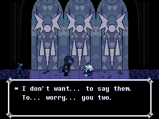 All through the chapter Ralsei is acting weird, desperate to find something before the other two. I think the "Ralsei is secretly evil because he clearly knows more than he's letting on, is secretive about his past, and keeps talking to the protagonist in private" theory is far fetched, but after a mishap involving one of Gerson's statues Susie finally snaps at him, causing him to break down into tears.