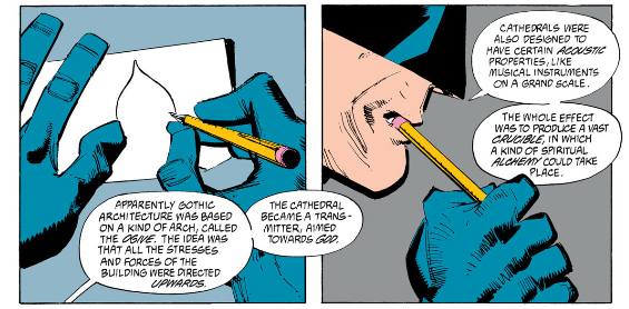 As he tries to connect the dots on Mr. Whisper and the Gotham cathedral, Batman muses on how gothic architecture was based on a shape known as an ogive. Here he is drawing one for Alfred.