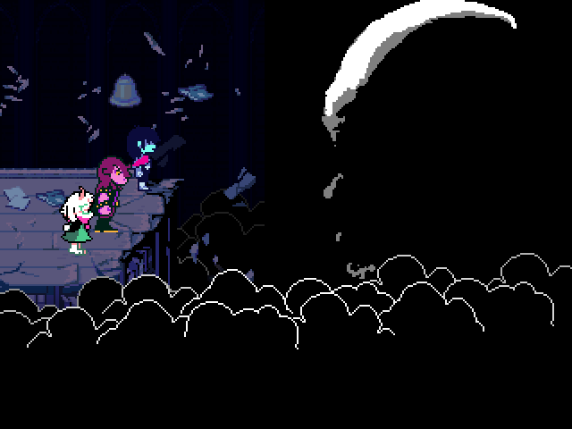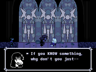We'll speculate on who the Knight is later. But now that we've seen it, or at least what we're led to believe is the Knight (after the big reveal of who Mike is, I don't know what in this game is a supposed to be legitimate plot development and what is just Fox fucking with everyone, henceforth known as Toby Fox Troll Logic™), when I want to refer to the hypothetical top of the Deltarune antagonist food chain - be it Gaster, the vessel, Carol, "Raha," or Fox himself - I'm going to use "the Devil" as the catch-all in reference to the tarot card about a mysterious entity hiding in the shadows. Again, it's hypothetical, maybe it stops at the Knight or the Angel, and I don't actually believe Fox is the ultimate baddy of the game anyway.