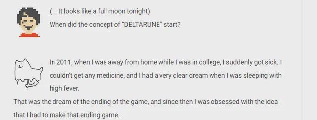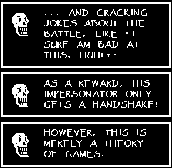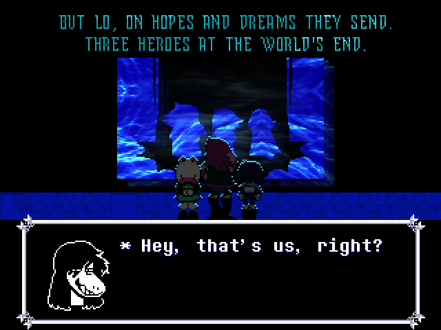 Before we dive into Deltarune Chapters 3 and 4, I want to share something I was emailed after I posted the Closing Thoughts update to the previous page. Alpha of FTLFW (who I did this interview for and want to give a shoutout to for proofreading this page and catching my myriad of typos. And then I found more stuff to add, so hopefully I didn't introduce any major mistakes) sent me some very enlightening information as to where "the player is the true villain of Toby Fox's games" comes from.