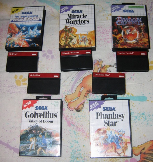 ![]() The Games I photographed five games for a reason: they all look the same. Every game cartridge is black with a red and white-gridded sticker (except for Alex Kidd in Shinobi World, which is blue. Can't say why) with the game's name. Kind of dull. |